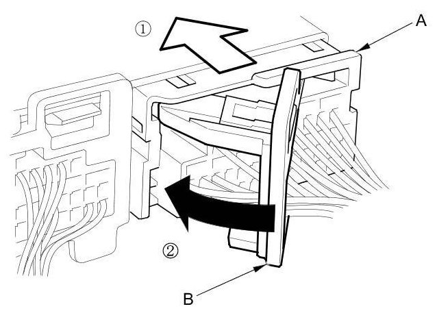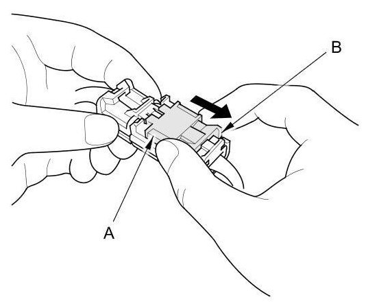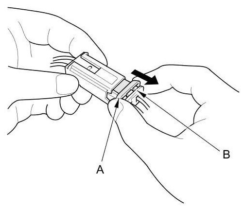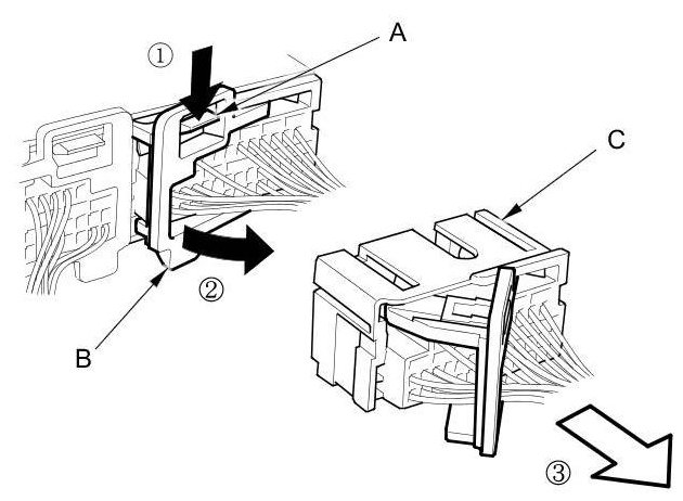 To release the lock (A), pull the lever (B) while pushing the lock on the outside of the connector, then pull out the connector (C).
