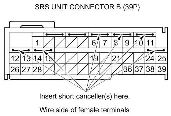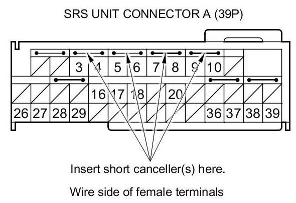 When SRS unit connectors A (39P) and B (39P) are disconnected, short circuits are automatically created in the connector to prevent accidental deployment of an airbag or tensioner. The circuit may need to be opened sometimes when diagnosing the system. Insert an SRS short canceller in the specified cavities when necessary to keep the circuit open for diagnosis.