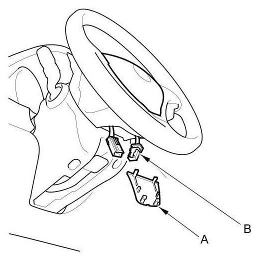 2. Remove the access panel (A) from the steering wheel, then disconnect the cable reel 4P connector (B) from the driver's airbag 4P connector.
