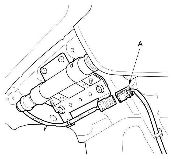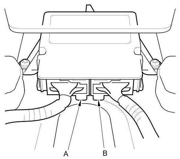 To reconnect the connector (A), push in on the connector. As the connector is pressed in, the lever (B) moves to the locked position.