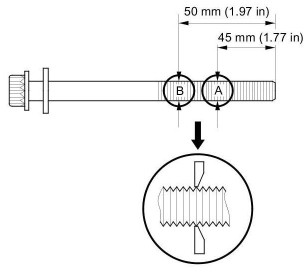 If either diameter is less than 11.3 mm (0.445 in), replace the cylinder head bolt.