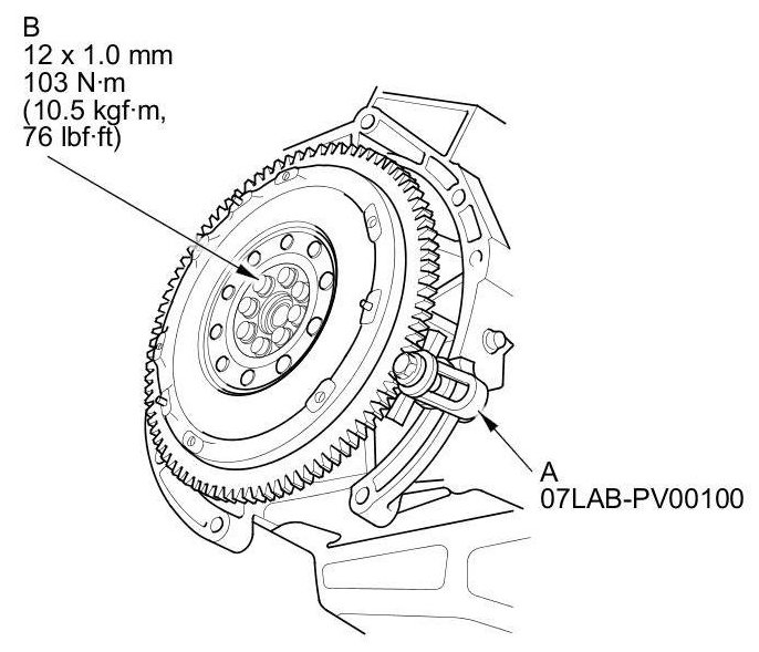 Install the ring gear holder (A), then torque the flywheel bolts (B) 103 Nm (10.5 kg-m, 76 lb-ft)