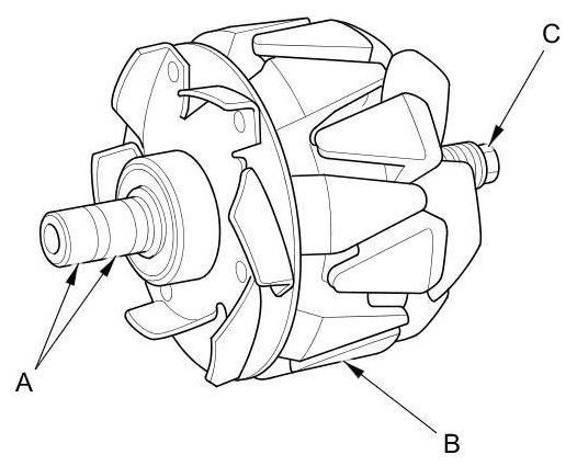 15. Check for continuity between each slip ring and the rotor (B) and the rotor shaft (C):