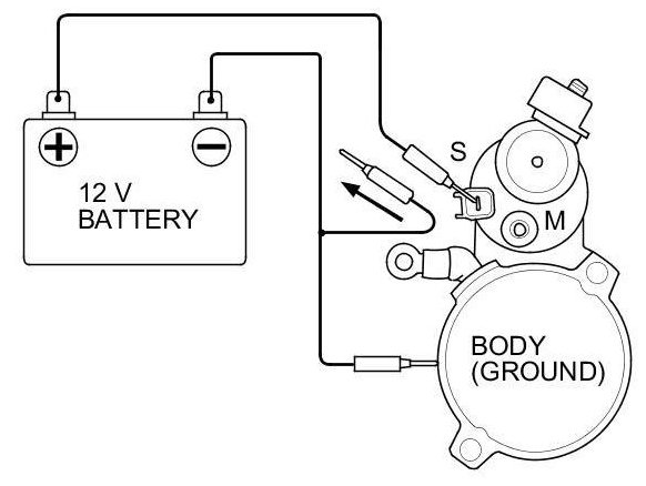 7. Disconnect the battery from the M terminal. If the pinion does not retract, the hold-in coil of the solenoid is working properly.