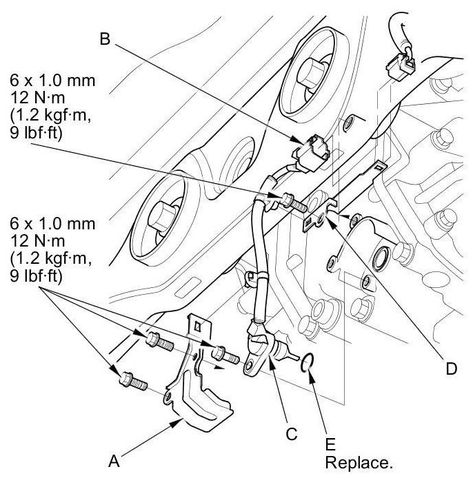 4. Install the rear differential fluid temperature sensor with a new O-ring (E) in the reverse order of removal.