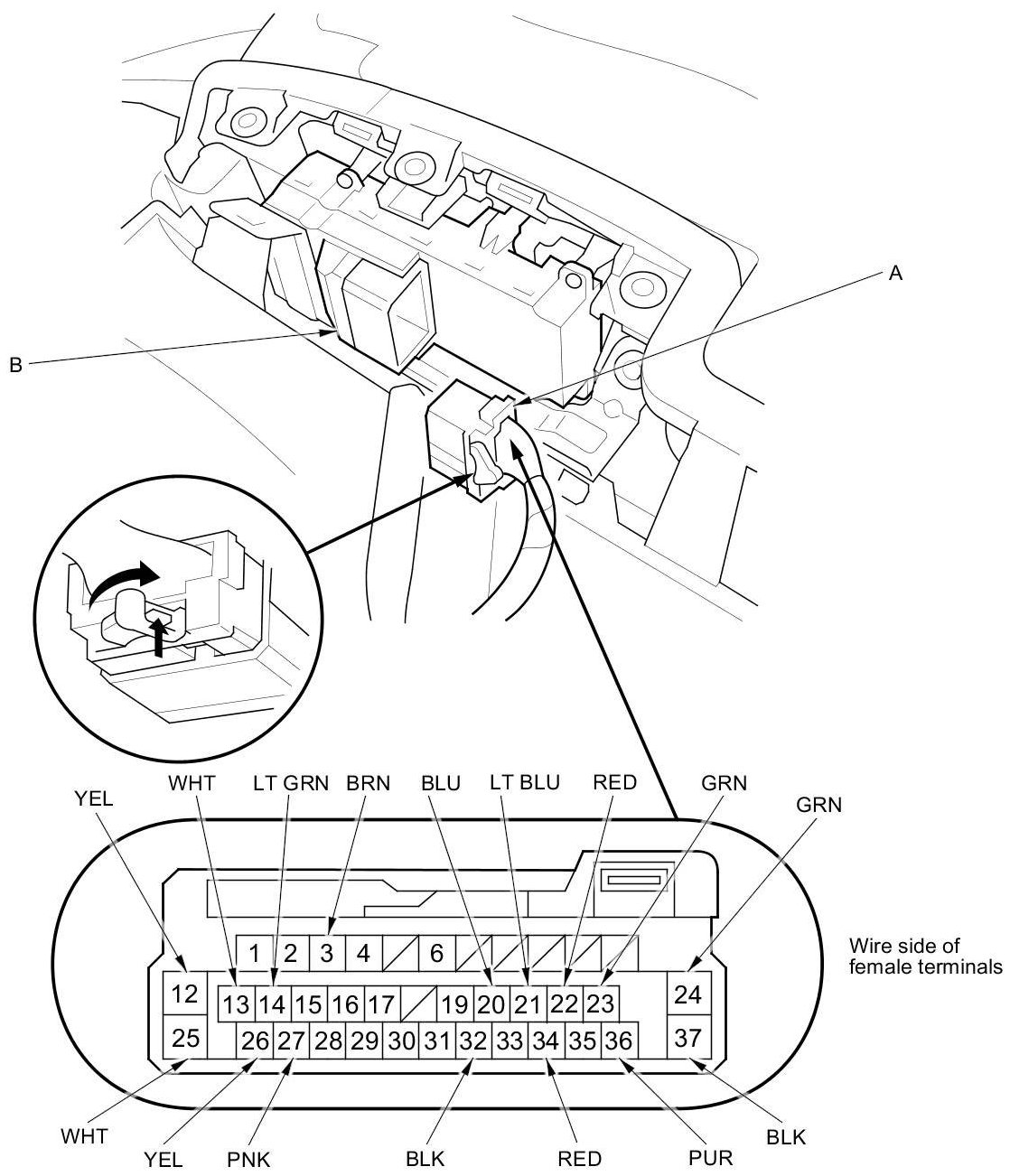 3. Disconnect the power window master switch 37P connector (A) from the power window master switch (B).