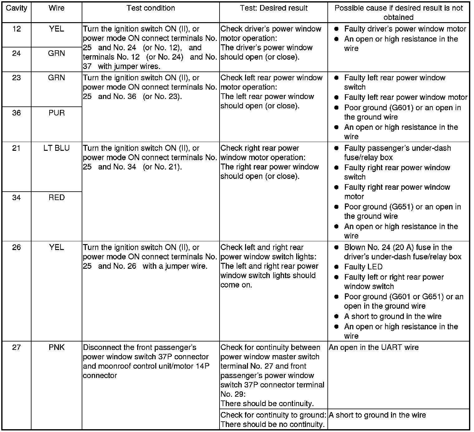 6. With the power window master switch 37P connector still disconnected from the power window master switch, do the following input tests: