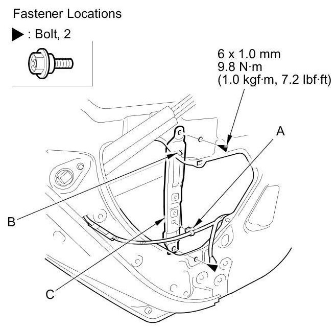 5. Detach the harness clip (A). Remove the bolts, and release the hook (B), then remove the door panel bracket (C).