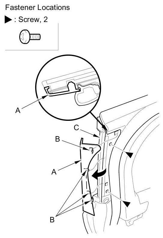 12. Pull back the rear pillar inner trim (A) to release the hooks (B), then remove the trim. Remove the screws securing the quarter glass (C).