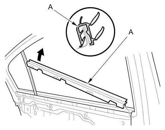 13. Starting at the rear, pull up the door inner weatherstrip (A), then remove it.