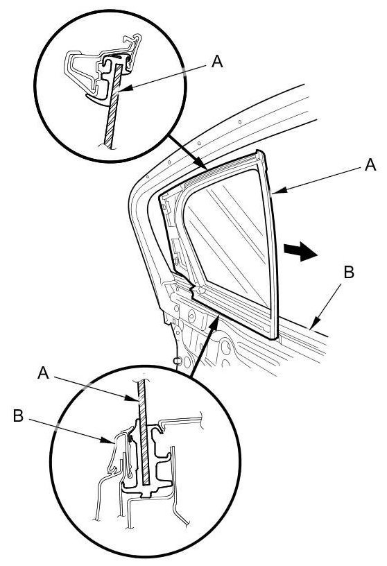 NOTE: Take care not to damage the door glass outer weatherstrip (B).