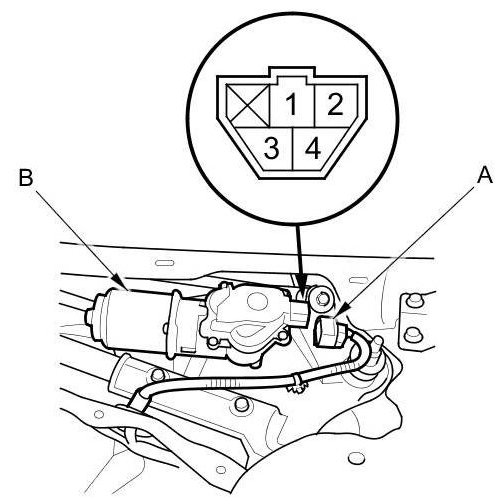 3. Disconnect the 4P connector (A) from the windshield wiper motor (B).