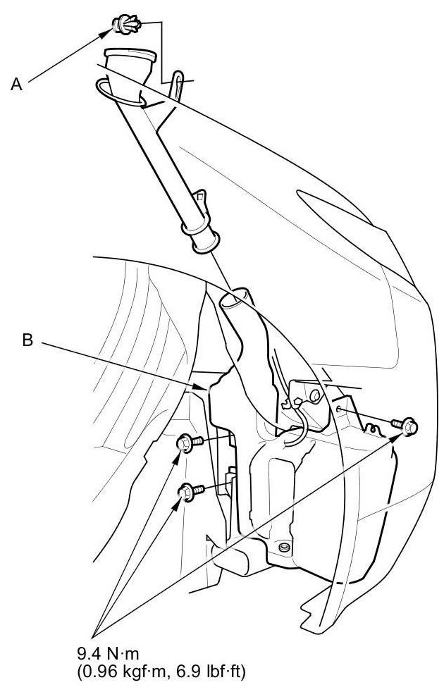 4. Remove the clip (A) and three bolts from the washer reservoir (B).