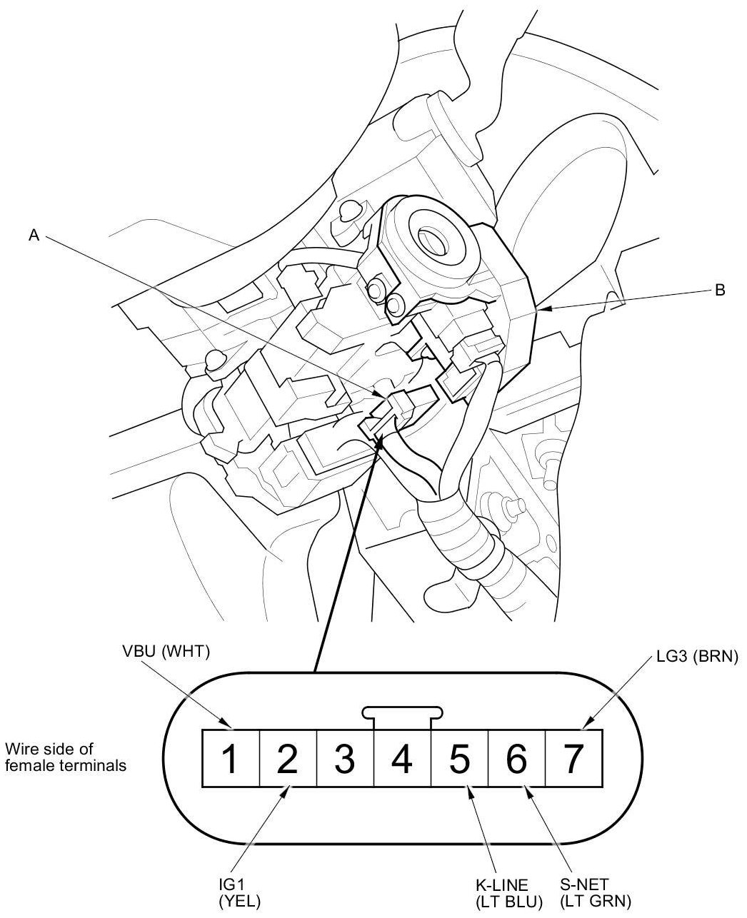 2. Disconnect the 7P connector (A) from the immobilizer-keyless control unit (B).
