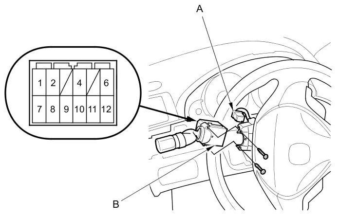 3. Disconnect the dashboard wire harness 12P connector (A) from the combination light switch (B).