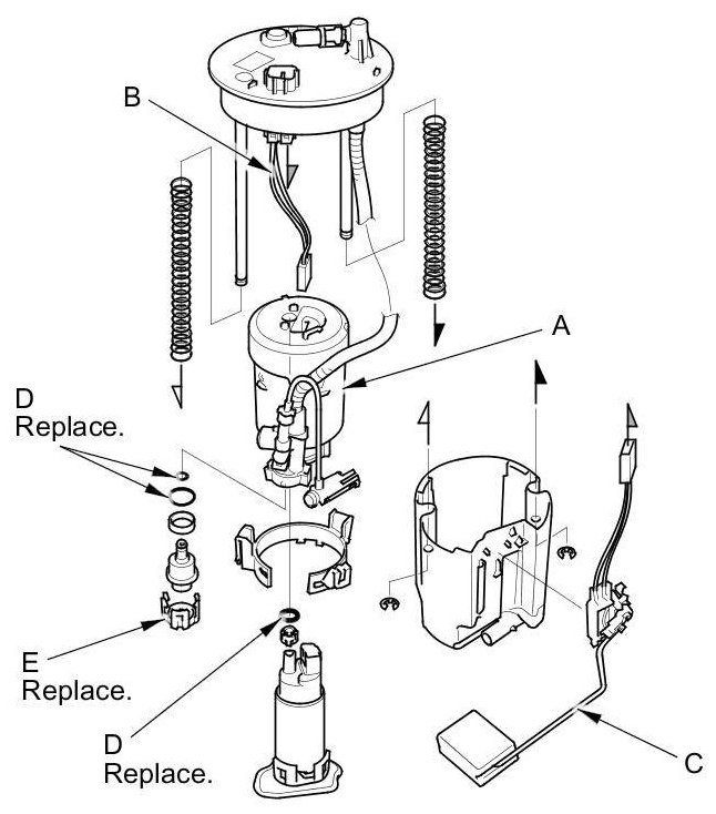4. Install the parts in the reverse order of removal with new O-rings (D) and a new bracket (E). When installing the fuel tank unit, align the marks on the unit and the fuel tank.