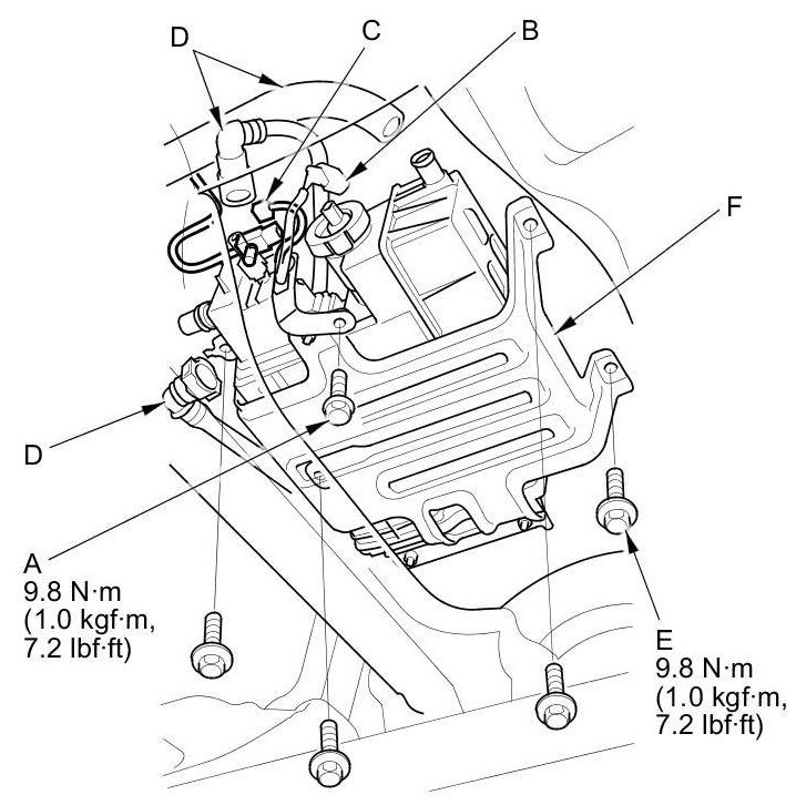 2. Remove the bolts (E), and move the EVAP canister assembly (F) to the rear.