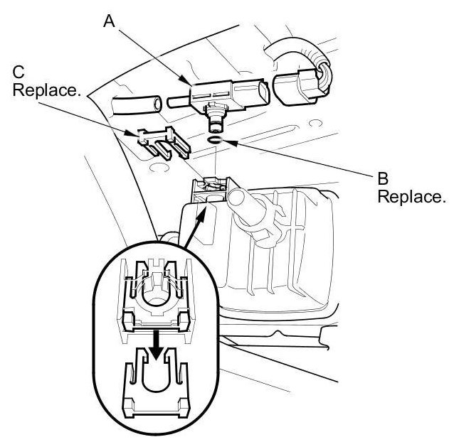 4. Install the parts in the reverse order of removal with a new O-ring (B) and a new retainer (C).