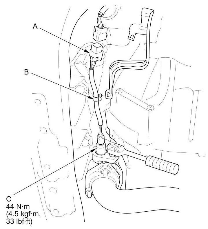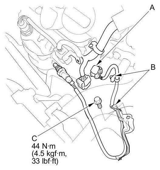 1. Disconnect the front secondary HO2S 4P connector (A), and remove the harness clamps (B) and the bolt (C).