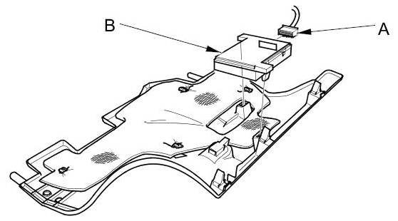 2. Disconnect the 28P connector (A) from the HandsFreeLink control unit (B), and remove it.