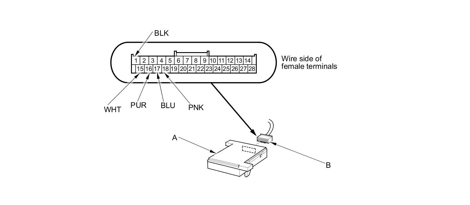3. Inspect the connector (B) and socket terminals for a good pin fit to be sure they are all making good contact.