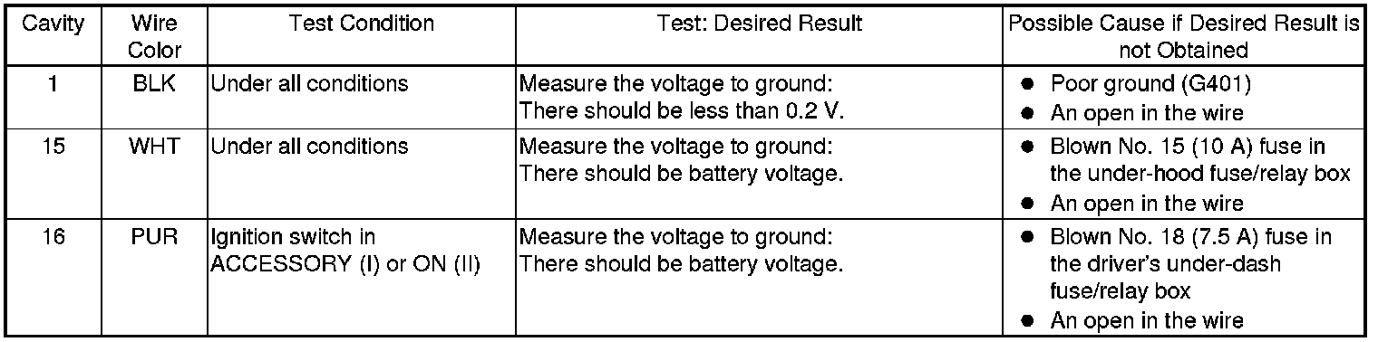 4. Reconnect the connector, and make these input tests at the connector.