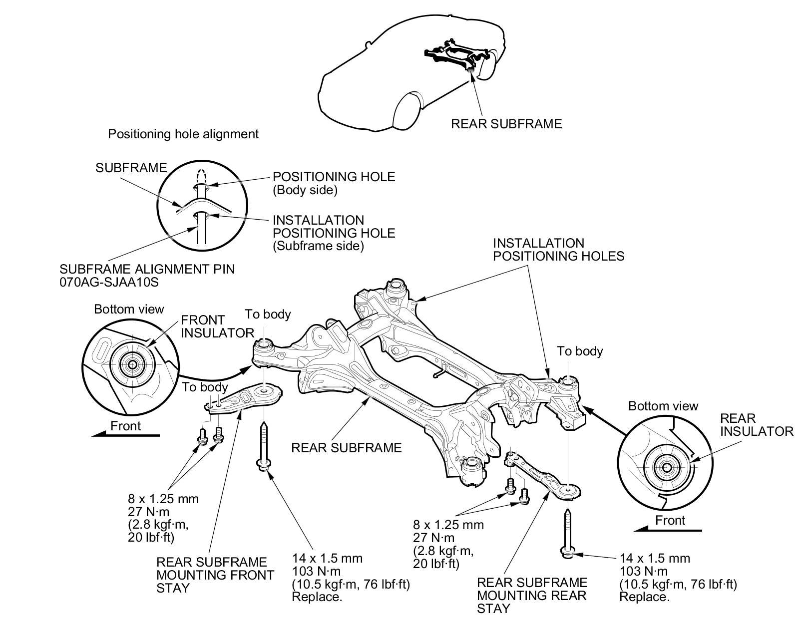 5. Tighten the subframe mounting bolts to the specified torque values starting with the right rear subframe mounting bolt. Use the subframe alignment pin when tightening the rear side subframe mounting bolts.