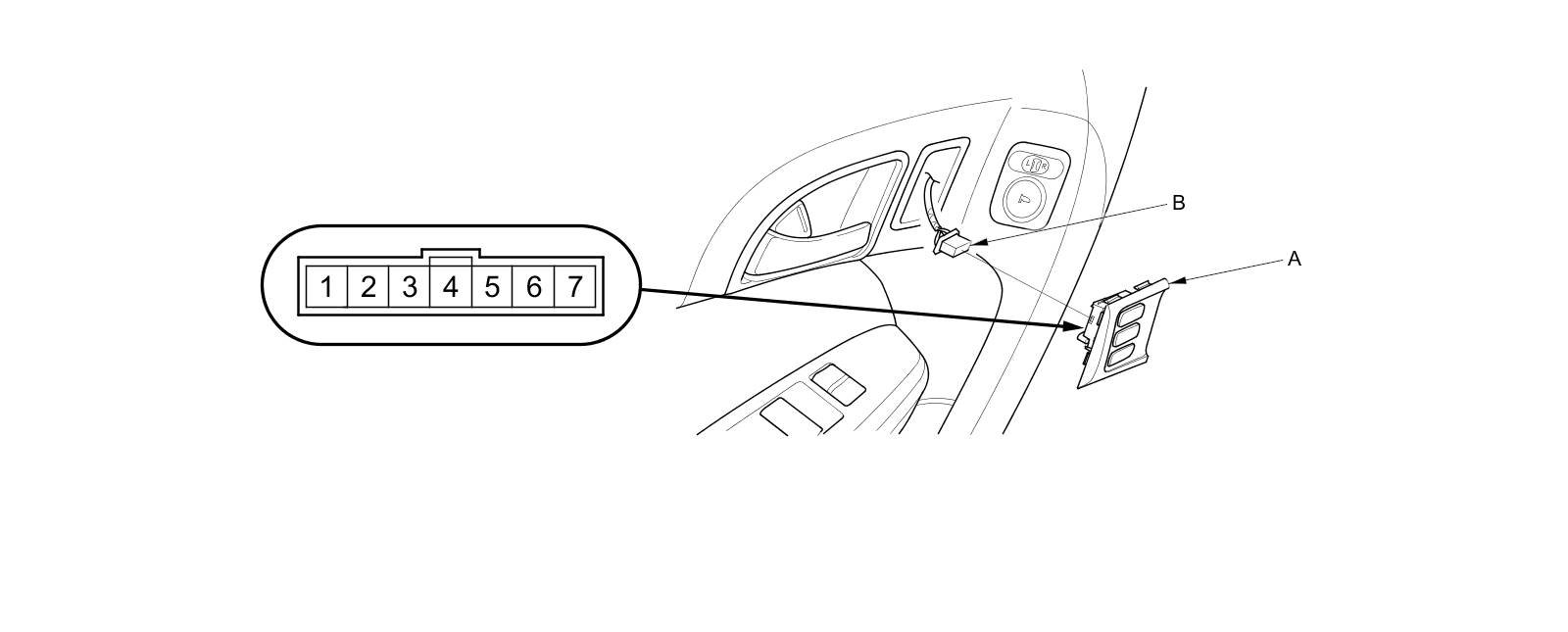 2. Disconnect the 7P connector (B) from the driving position memory switch.
