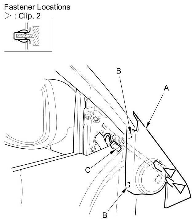 6. Release the catch (A) from the hole in the door, then remove the mirror (B).