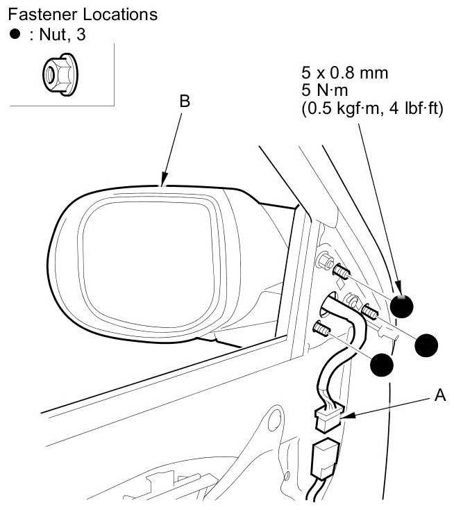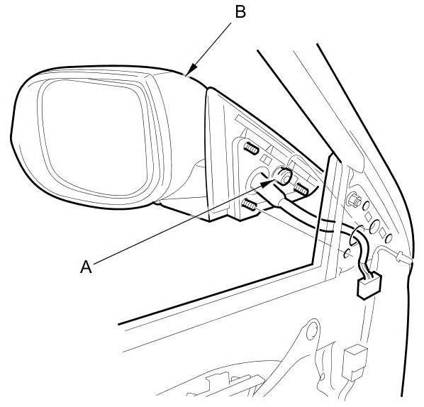 5. While holding the mirror (B), remove the nuts securing the mirror.