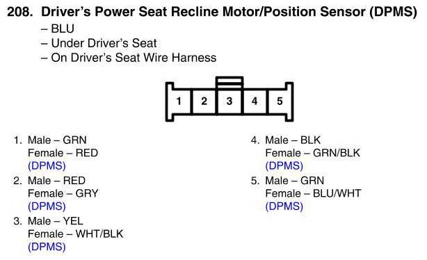 View 208 - Driver's Power Seat Recline Motor/Position Sensor Connector View (DPMS)