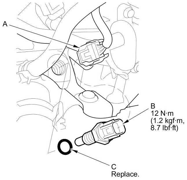 4. Install the parts in the reverse order of removal with a new O-ring (C), then refill the radiator with engine coolant Service and Repair.