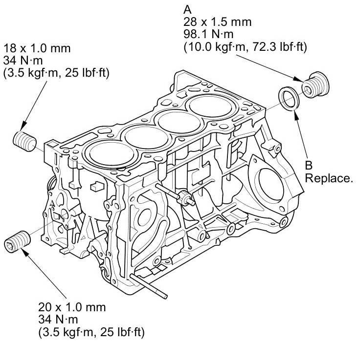 NOTE: When installing the sealing bolt (A), always use a new washer (B).