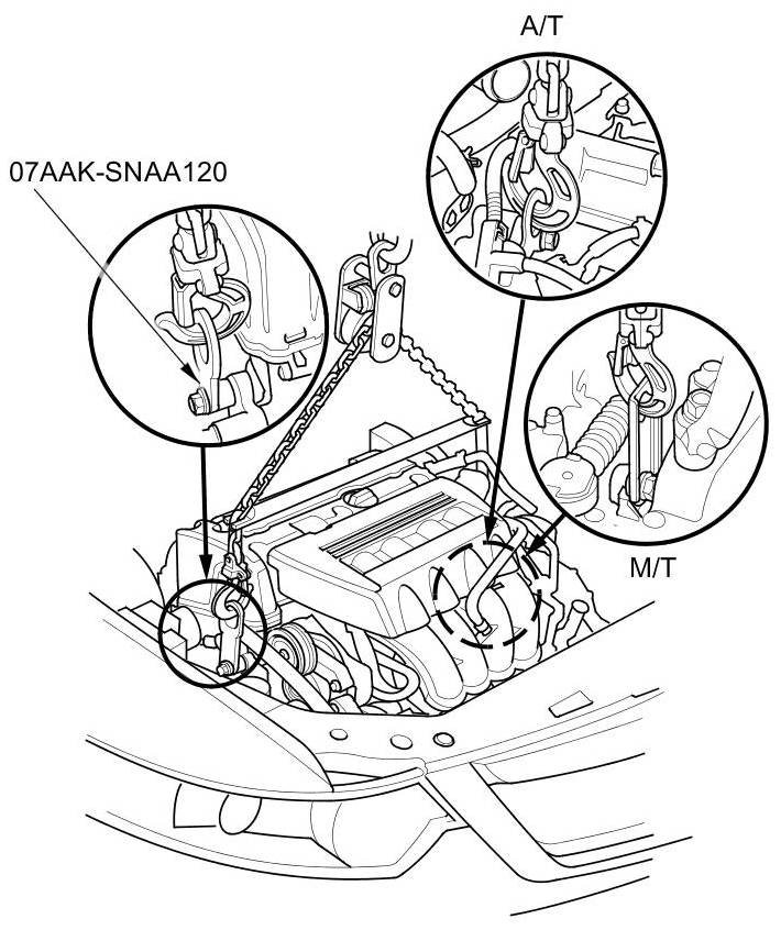 2. Raise the vehicle on the lift, and position the engine/transmission under the vehicle. Lower the vehicle, and attach the universal lifting eyelet (07AAK-SNAA120) and the chain hoist to the universal lifting eyelet and the transmission hanger, then lift the engine into position in the vehicle.