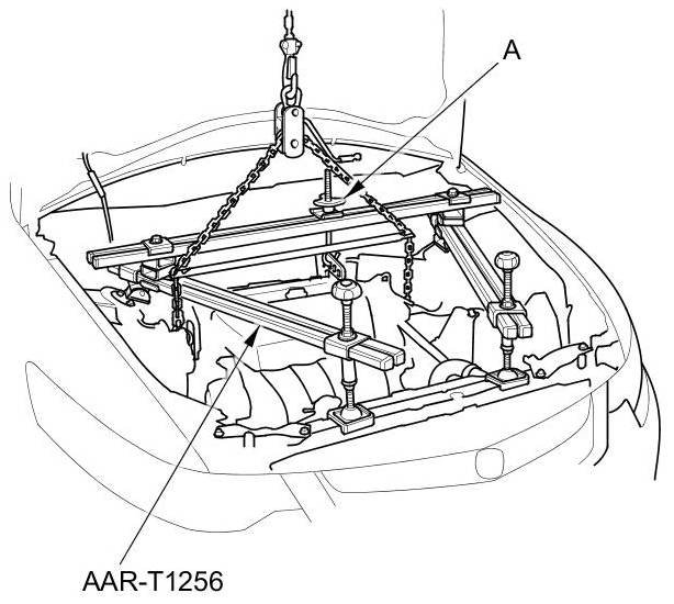 4. Install the engine support hanger (AAR-T1256) onto the vehicle as shown, and attach the hook to the slotted hole in the engine hanger adapter. Tighten the wing nut (A) by hand, and lift and support the engine/transmission.