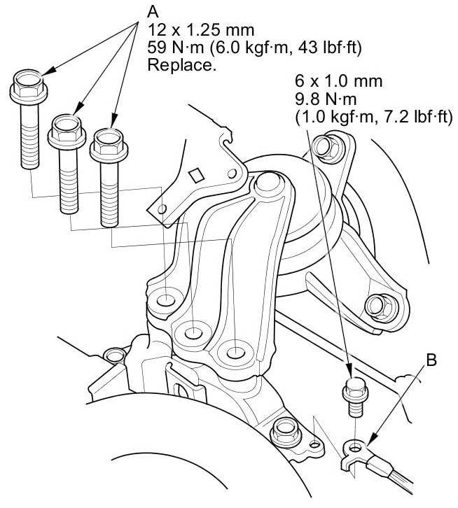 31. A/T: Install the rear engine mount upper bracket (A) using new bolt and the bolts. Lift and support the engine/transmission with a jack and a wood block under the engine/transmission, then install the rear engine mount (B).