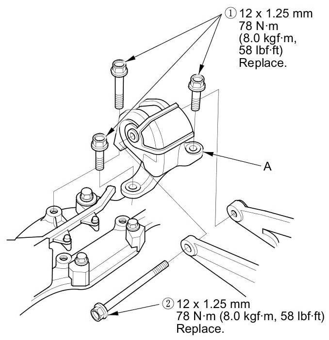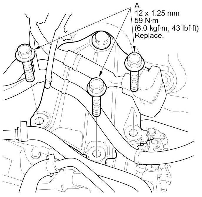 5. Tighten the new upper transmission mount bracket mounting bolts (A) to the specified torque.