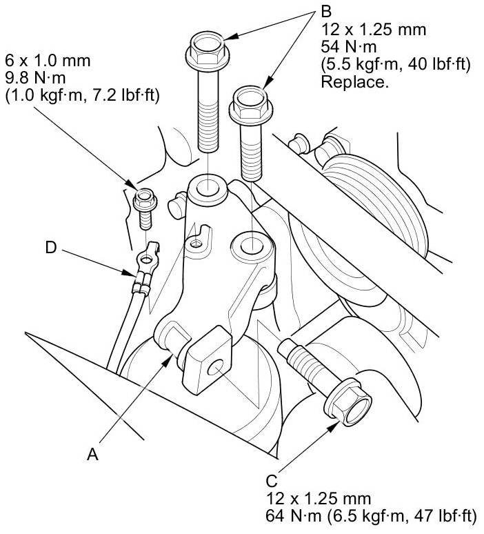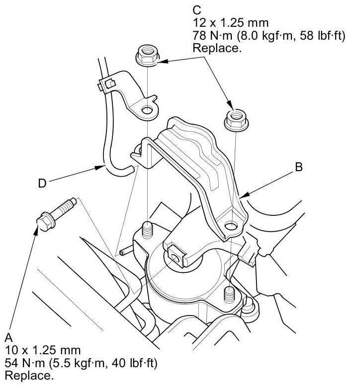 28. Tighten the new front engine mount mounting bolt (A), then install the front engine mount stop (B) using new nuts (C), and connect the vacuum hose (D).