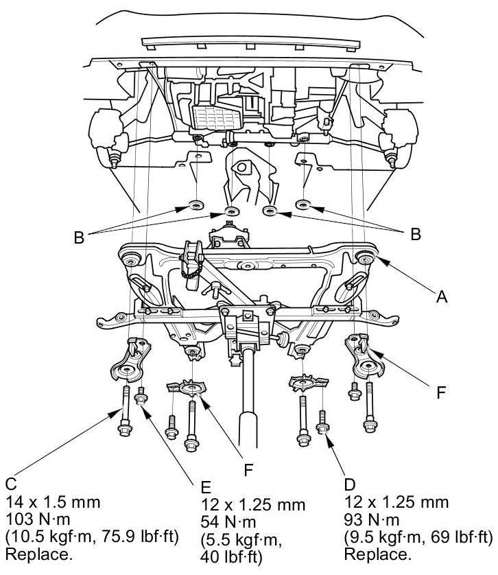13. Loosely install the new subframe mounting bolts (C), the new stiffener mounting bolts (D), and the stiffener mounting bolts (E).