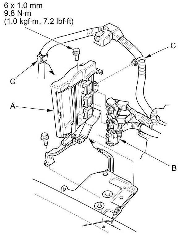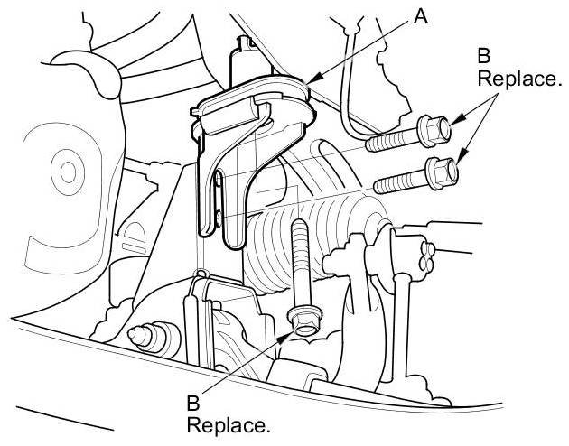 9. Install the side engine mount bracket (A), and tighten the new side engine mount bracket mounting bolts (B), then tighten the side engine mount mounting bolt (C).