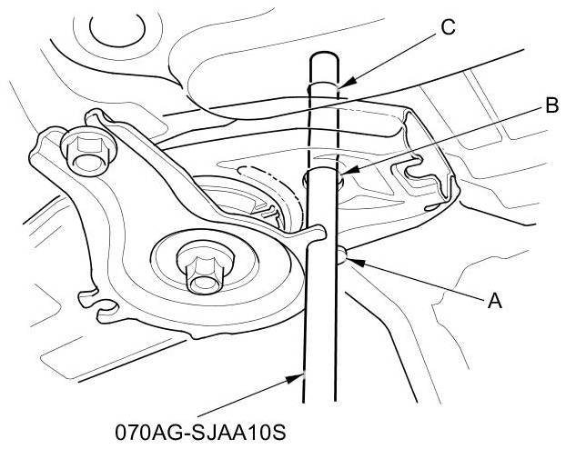 16. Insert the 15.7 mm side of the subframe alignment pin through the positioning slot (A) on the right rear stiffener, through the positioning hole (B) on the front subframe, and into the positioning hole (C) on the body, then loosely tighten the subframe right rear mounting bolt.