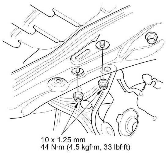 21. Tighten the front and rear subframe mounting bolts to the specified torque.