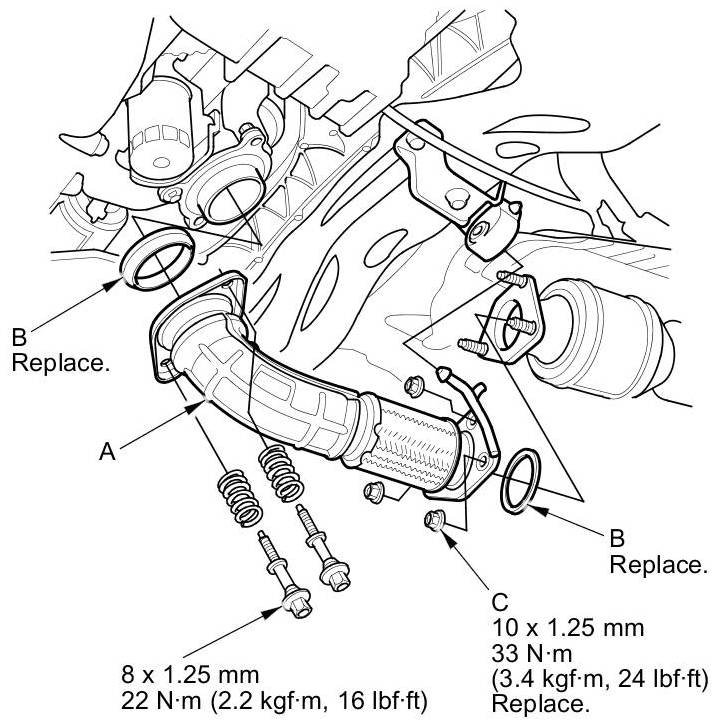41. Install exhaust pipe A using new gaskets (B) and new self-locking nuts (C).