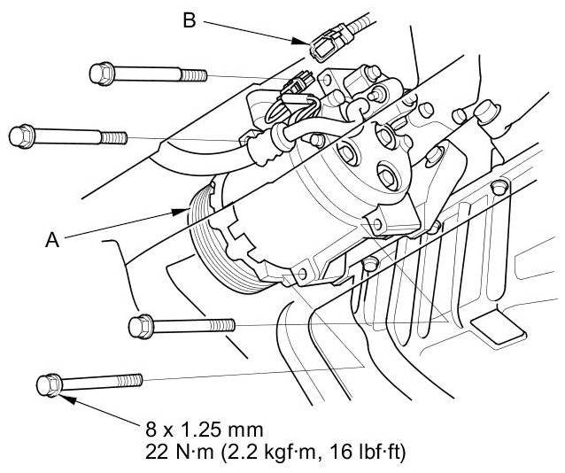 42. Install the A/C compressor (A), then connect the A/C compressor clutch connector (B).