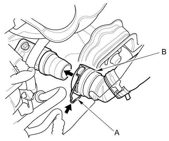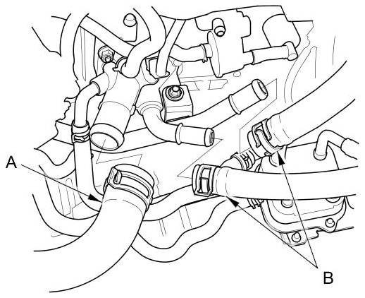 47. Connect the upper radiator hose (A) and the heater hoses (B).