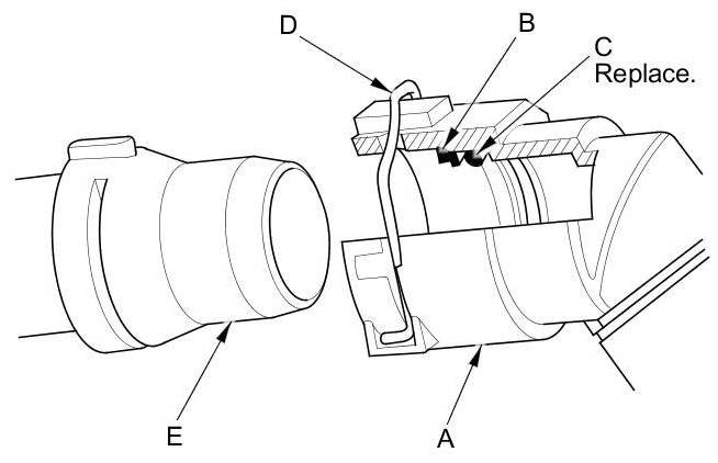 51. Check the lock (D). If the lock is damaged or deformed, replace it. When installing the new lock on the connector, push it straight down along the groove.