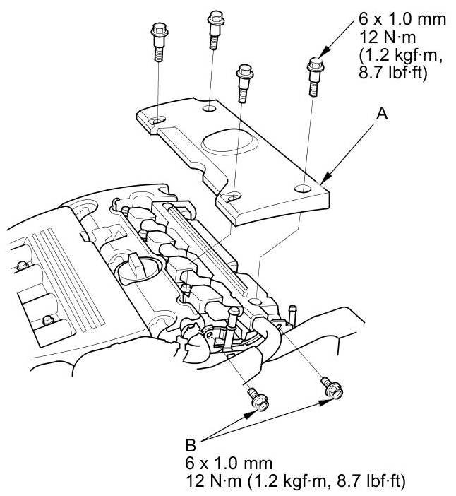 56. Install the ignition coil cover (A) and the brake booster vacuum line mounting bolts (B).