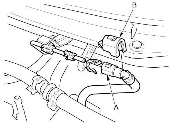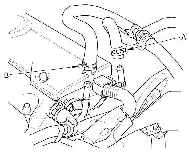 58. Install the EVAP canister hose (A) and the brake booster vacuum hose (B).