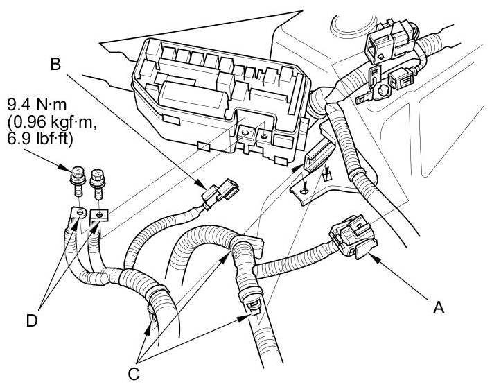 62. Install the battery cables (D) to the under-hood fuse/relay box.