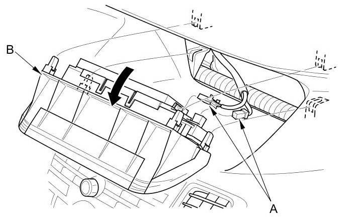 2. Disconnect the connectors (A), and remove the audio-HVAC display unit (B).